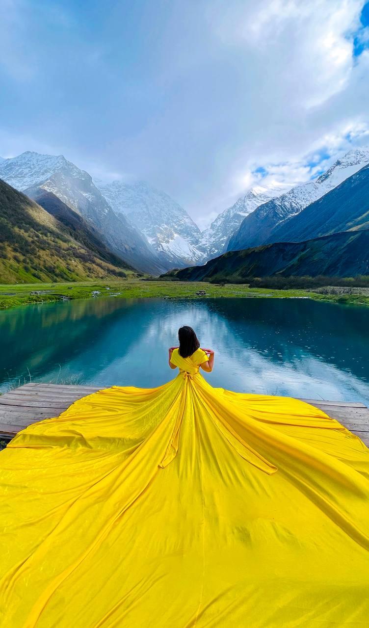-выездные фотосессии в горы Осетии в летящих платьях со шлейфом;